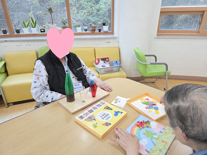 테트리즈 퍼즐 맞추기, 종이 입체 모자이크 꾸미기, 관절가동범위운동, 콘쌓기 등 맞춤형 재활프로그램을 진행하였습니다.