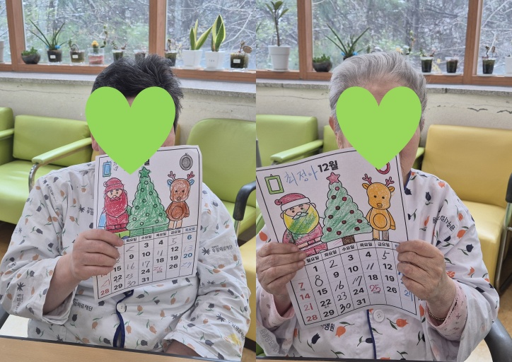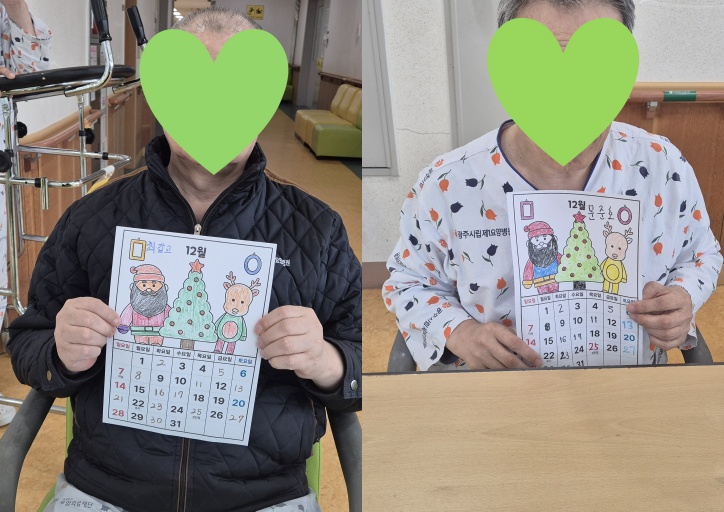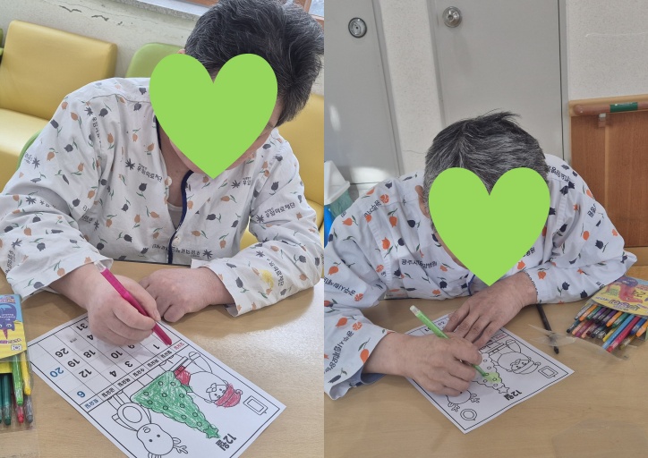 어르신들이 날짜를 채우는 활동, 숫자를 쓰며 손운동+인지기능, 요일과 날짜개념을 다시 떠올리며 시간 감각 유지 및 하루 구조화에 도움이 됩니다