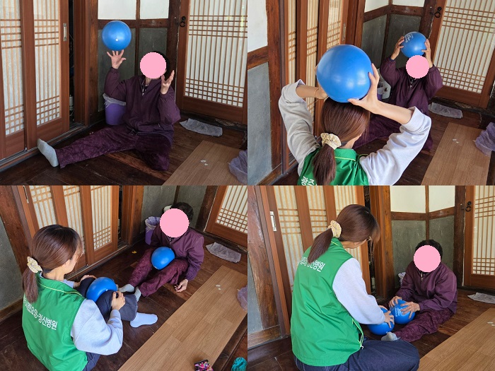 두 번째 방문에서는 미니 짐볼 운동과 건강박수, 뇌신경체조, 마당 산책을 통해 근력 강화와 균형 유지, 정서적 안정을 지원했습니다.