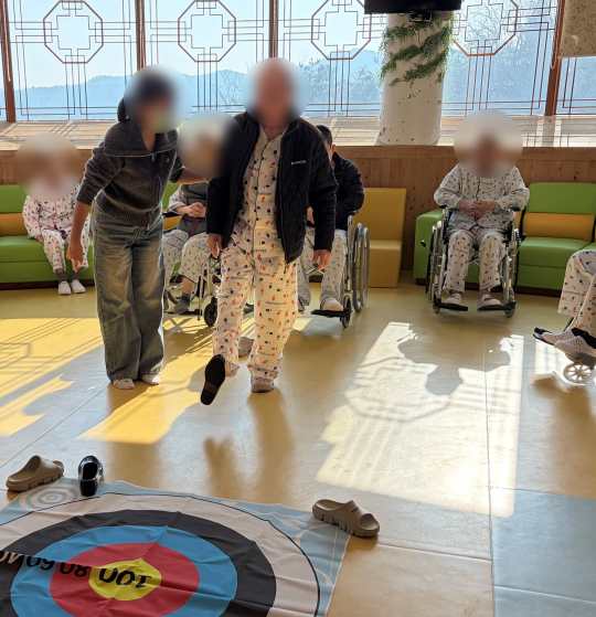 고무신 던져 과녁 맞추기 활동을 통해 어르신들의 집중력과 공간 인지 능력을 자극하였습니다.