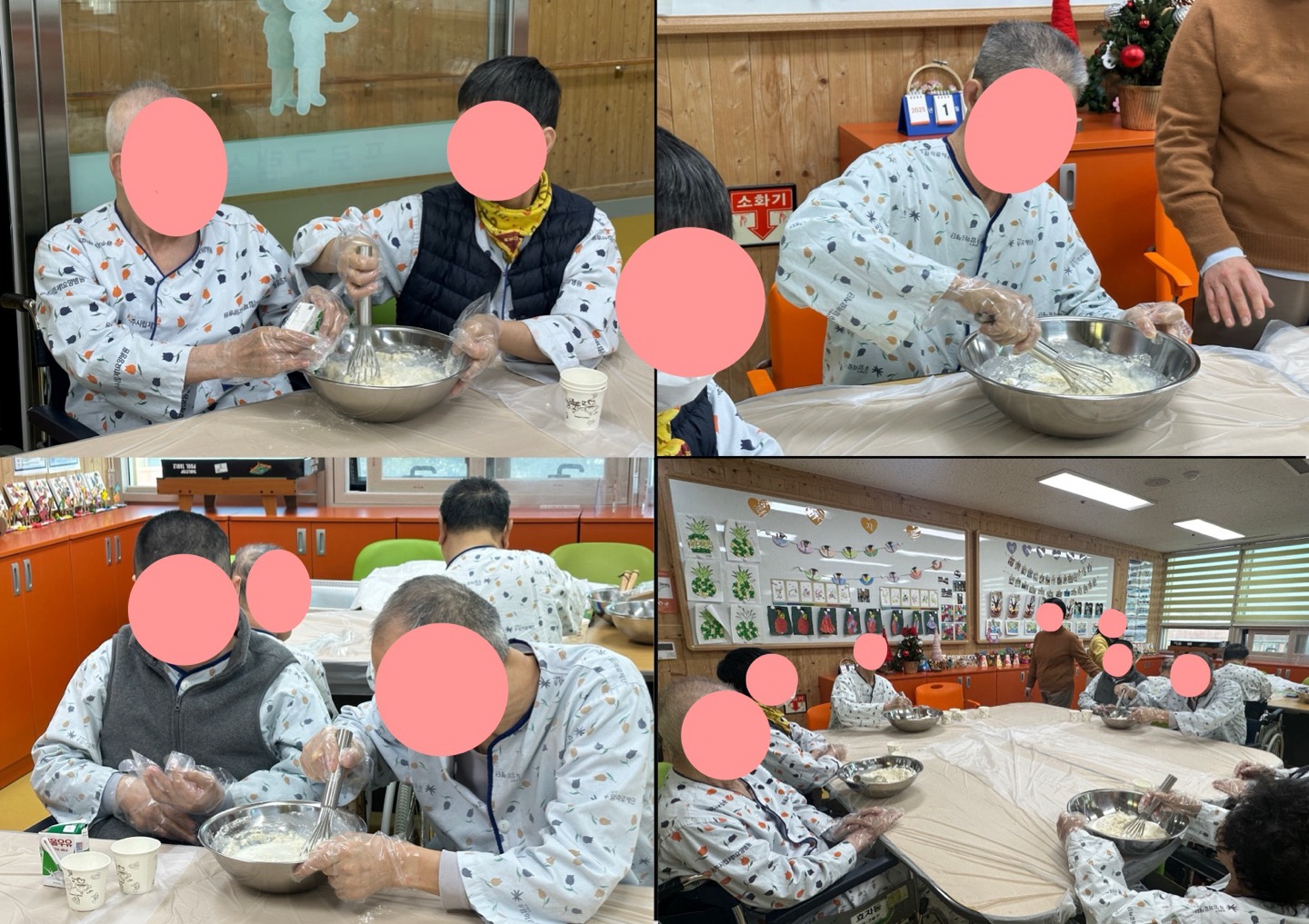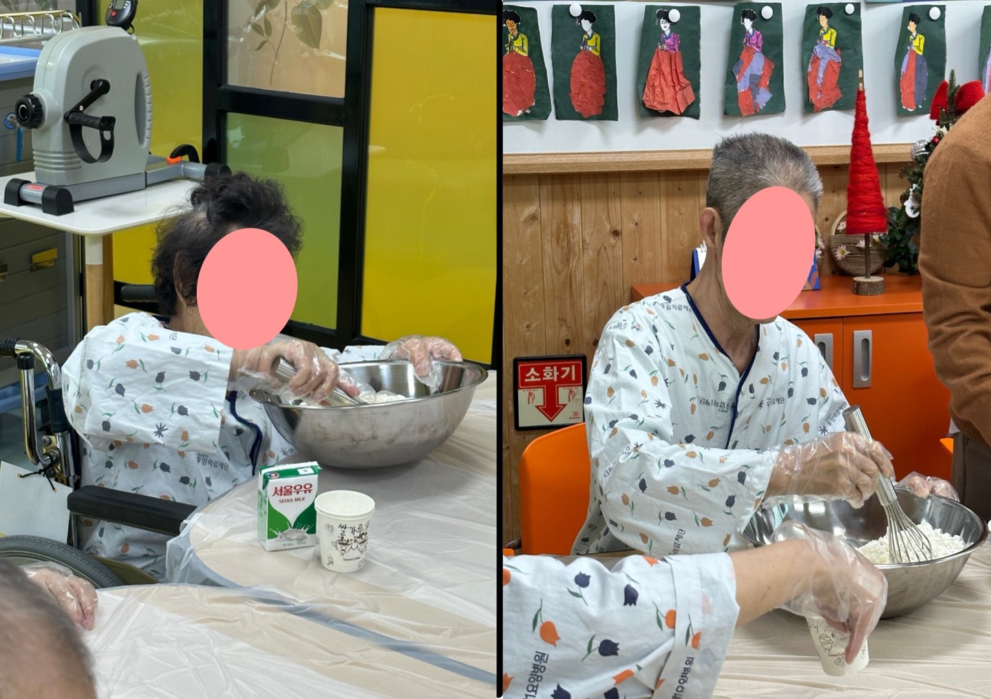 휘핑기를 이용하여 열심히 반죽을 젓는 어르신들