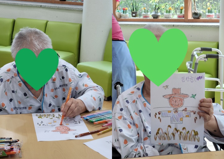 가을에 관련된 추석, 송편 허수아비, 벼 이삭 사과 등 여러가지 이야기를 나누면서 색칠을 해보았습니다. 다른날보다 많은 어르신들이 참여하셔셔 풍성한 이야기를 나눌 수 있어서 너무 좋아하셨습니다.