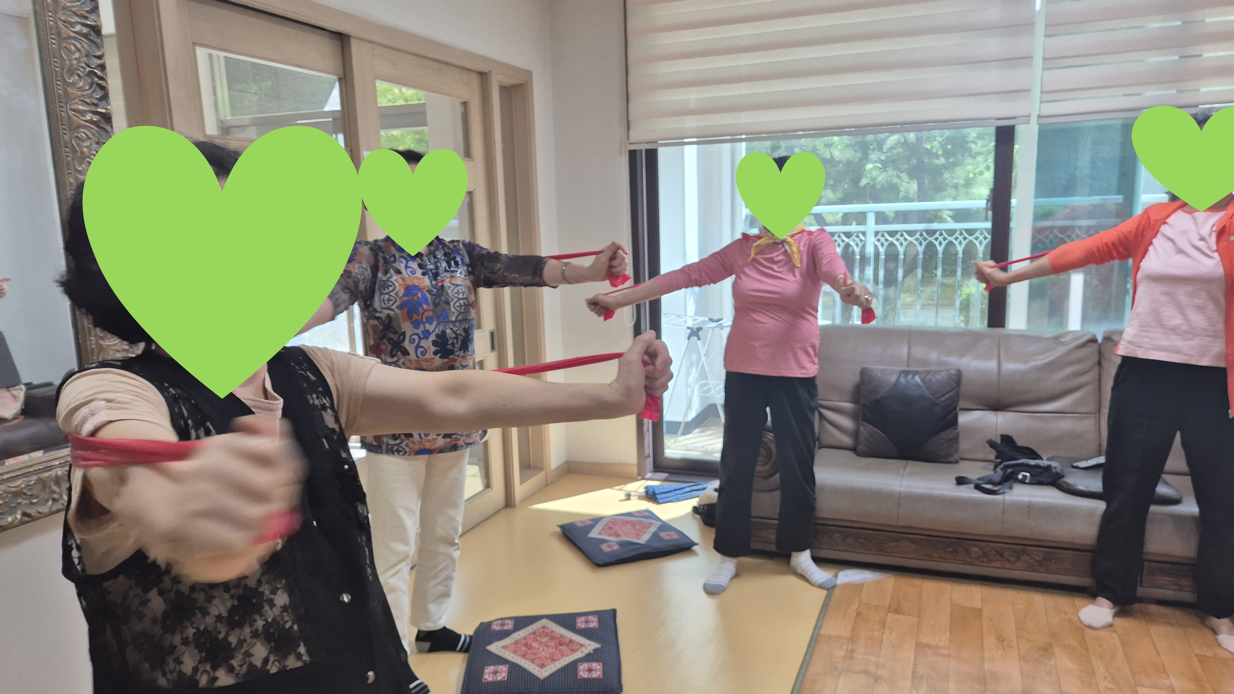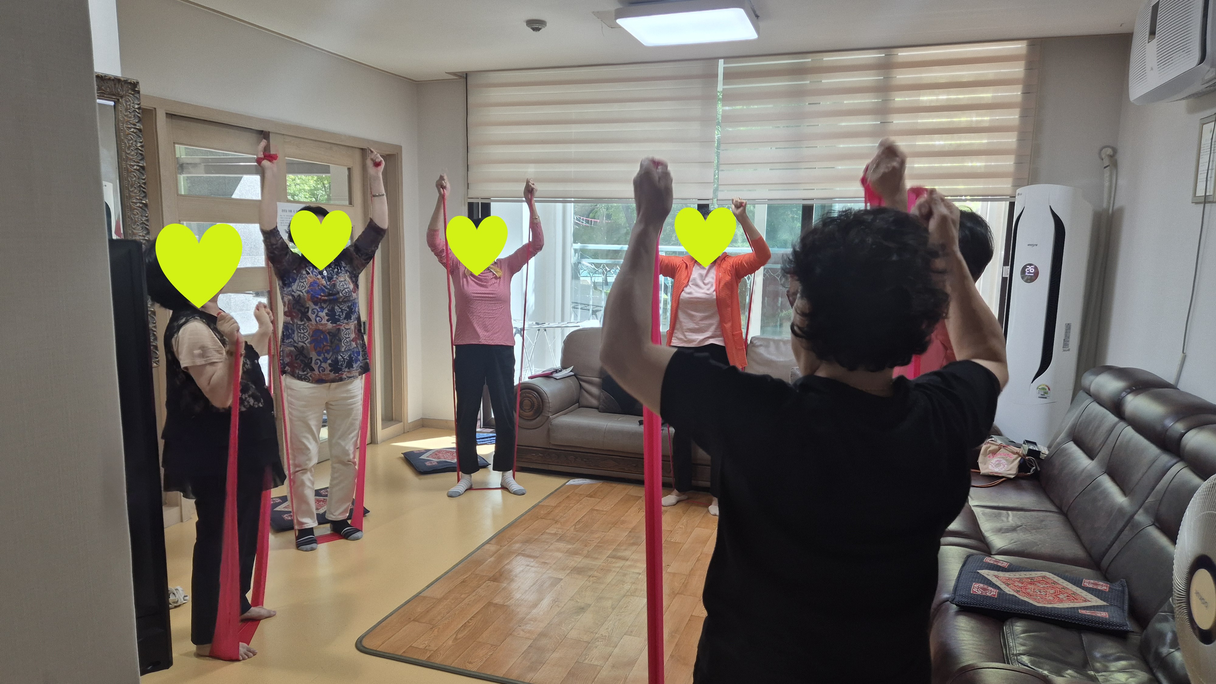 세라밴드를 활용한 근력 운동을 진행 하였습니다. 힘들지만 어르신들이 제일 좋아하는 운동 입니다