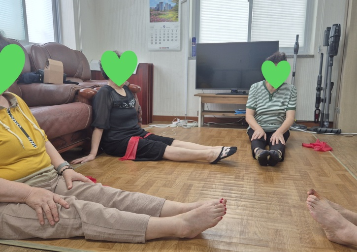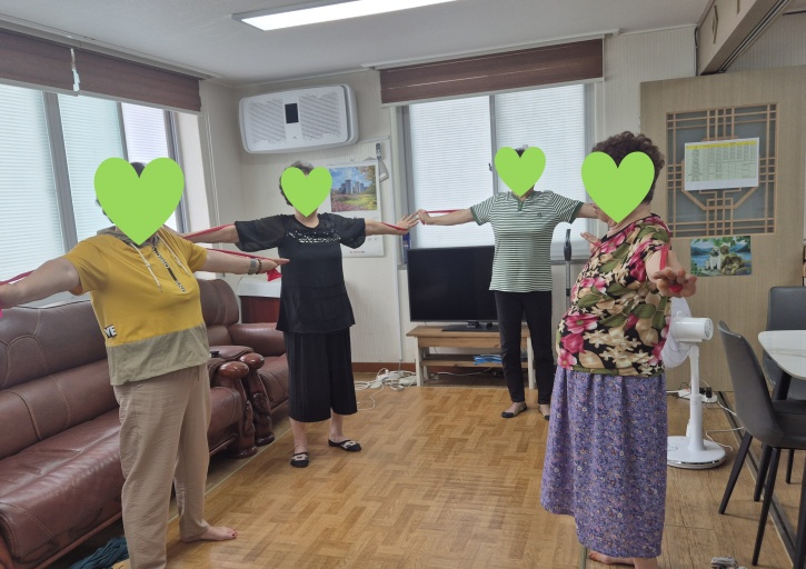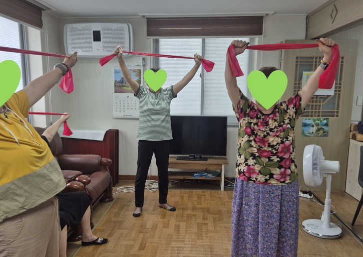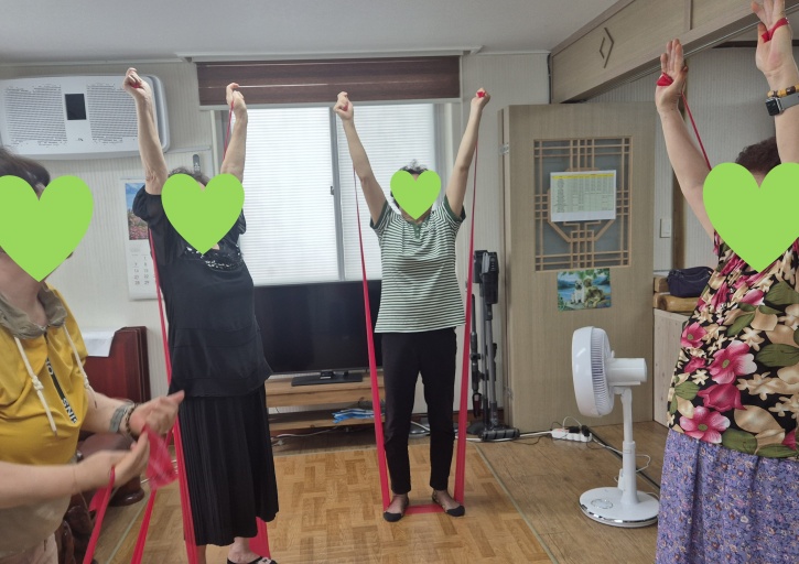 스트레칭과 건강박수로 몸을 풀며 프로그램을 시작하고 근력 운동을 위해 세라밴드 운동을 진행하였습니다.
