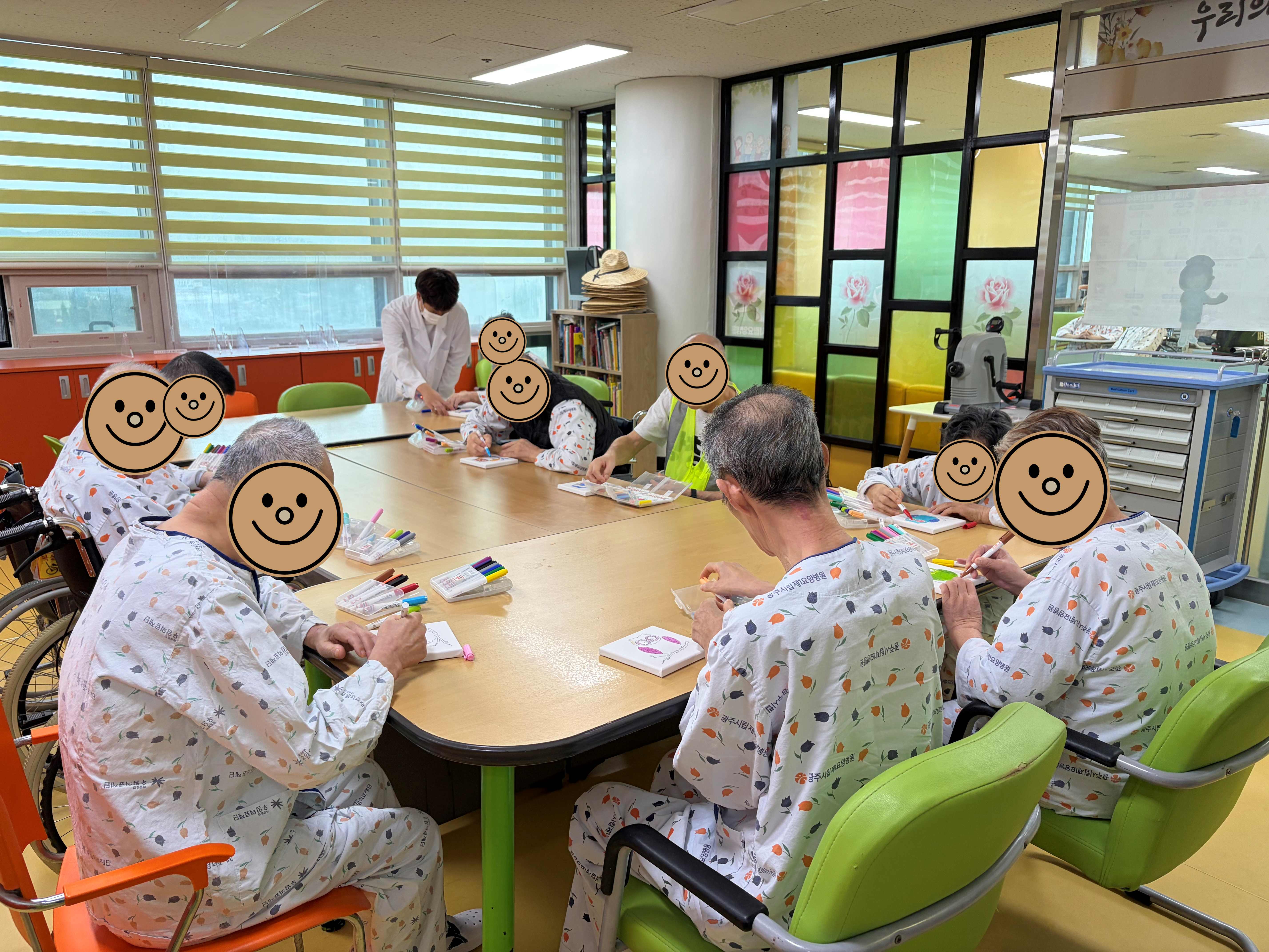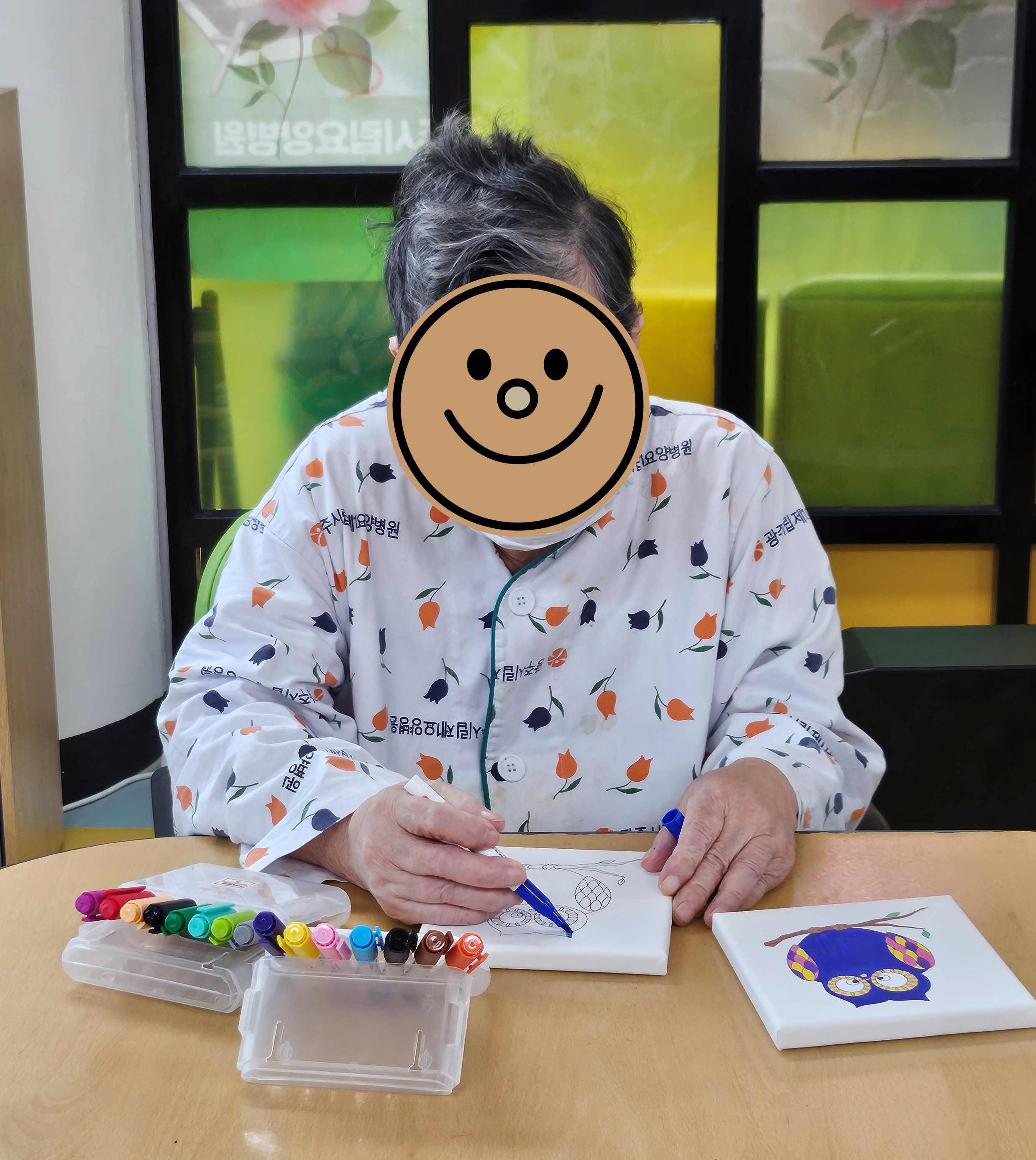 오늘은 어르신들과 캔버스 액자에 그려진 부엉이를 색칠하는 시간을 가졌습니다.