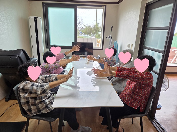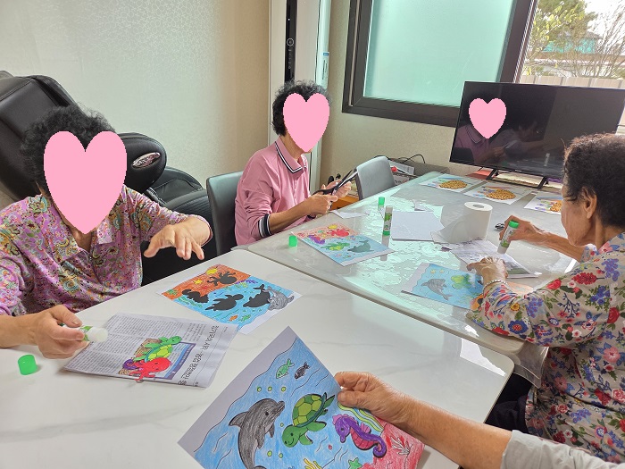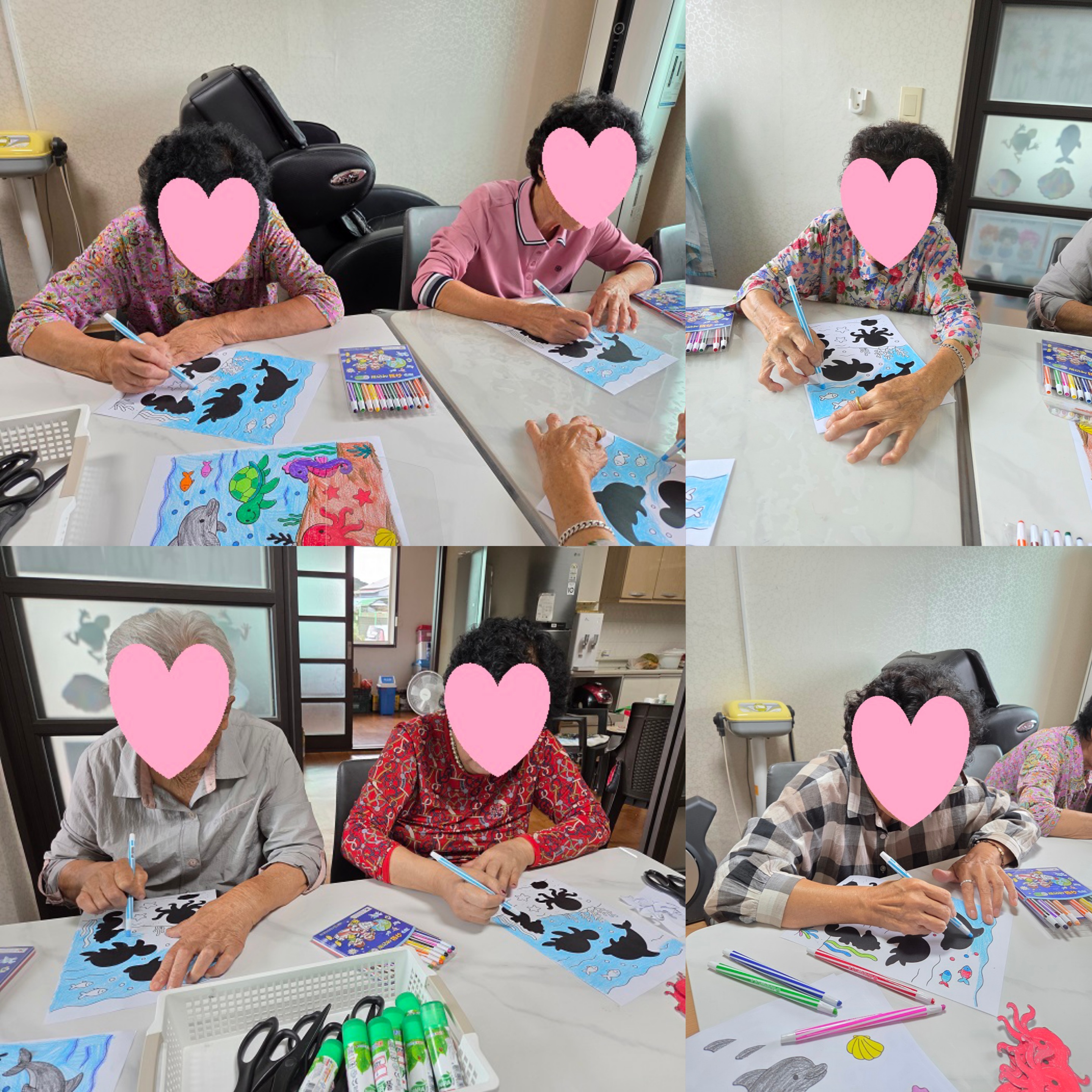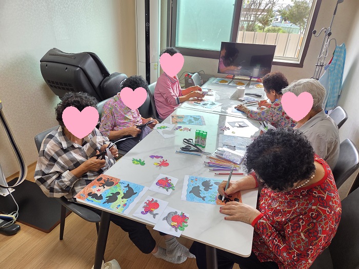 완성된 작품을 경로당의 벽면에 붙이고 각자의 작품을 속하고 칭찬하는 시간을 가졌습니다^^