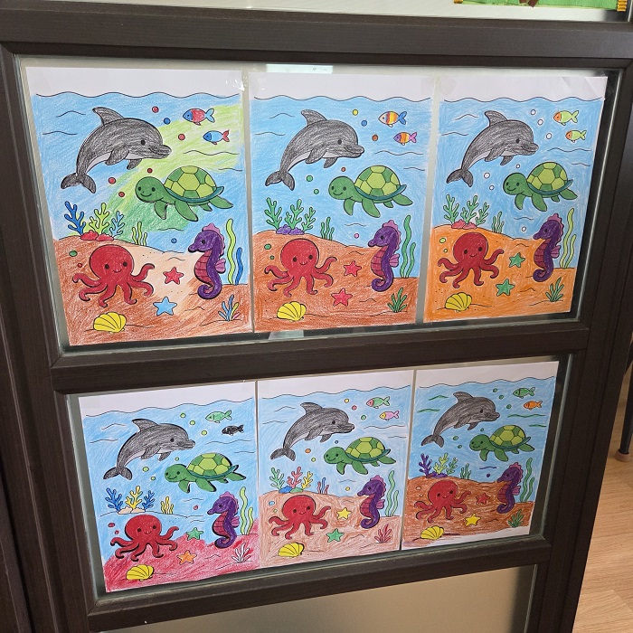 음악에 맞춰 스트레칭을 진행한 후 바다생물 색칠하여 오려붙이기 활동을 하였습니다.