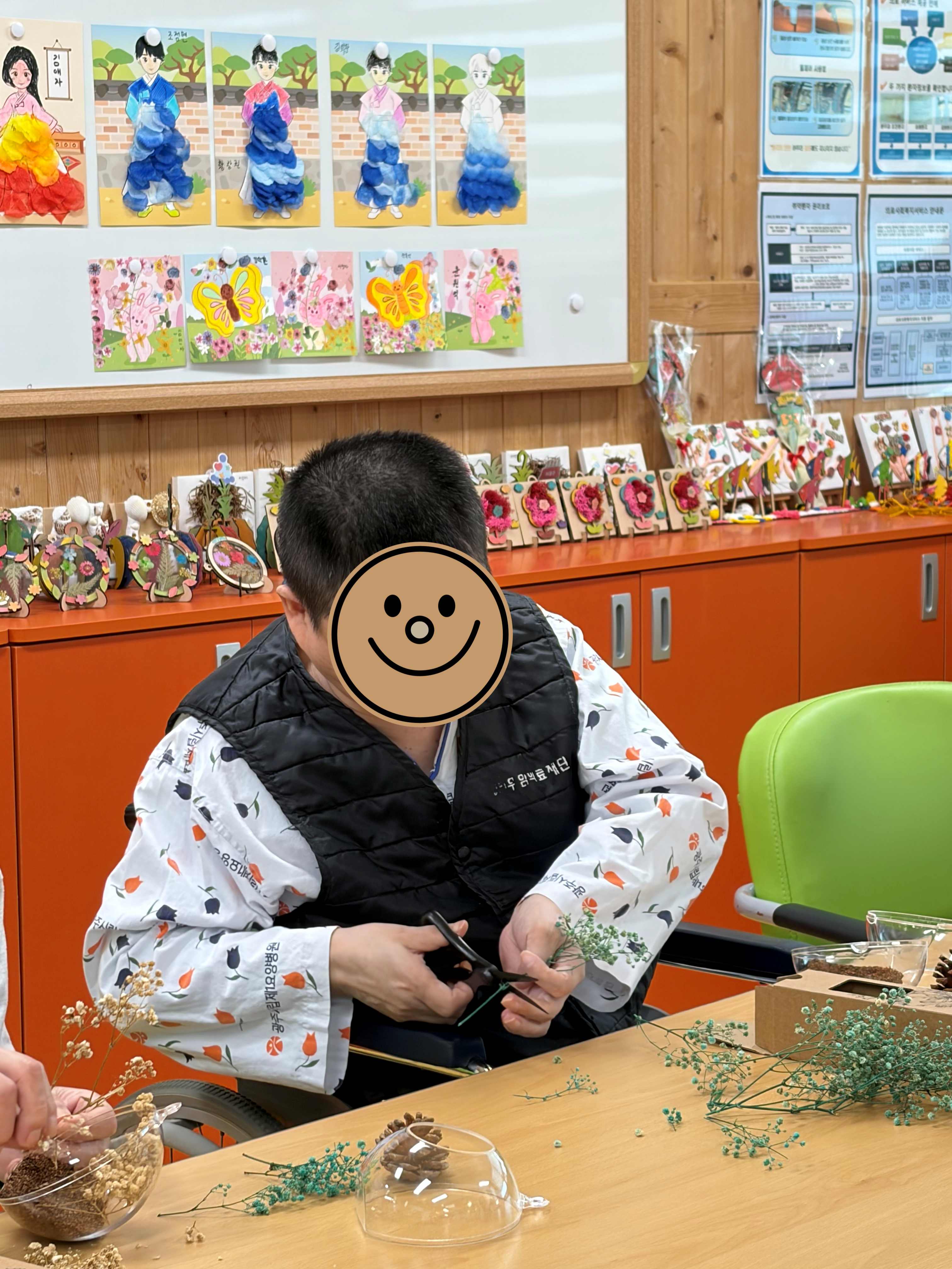 오늘은 어르신들과 가을에 어울리는 솔방울, 다람쥐,프리저브드 꽃등을 이용하여 테라리움을 만드는 시간을 가졌습니다.