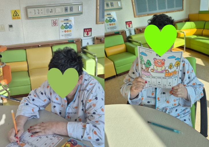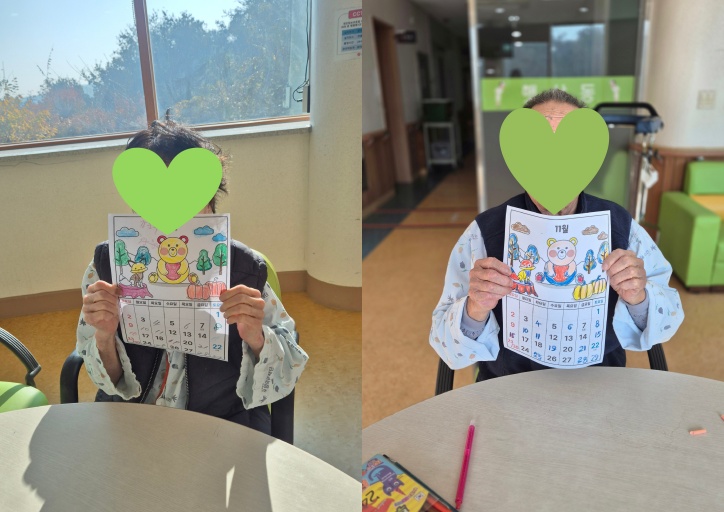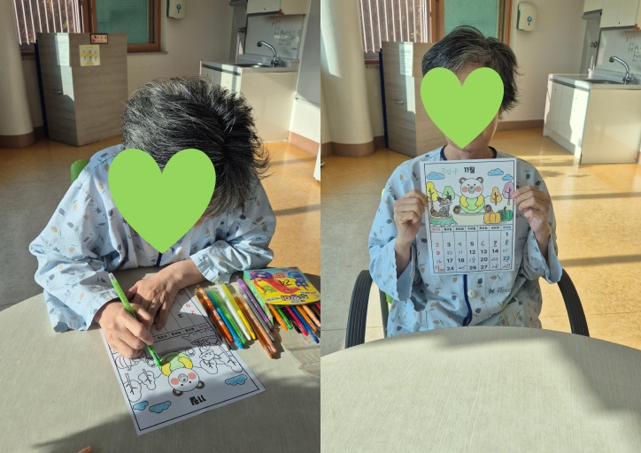 어르신들이 날짜를 채우는 활동, 숫자를 쓰며 손운동+인지기능, 요일과 날짜개념을 다시 떠올리며 시간 감각 유지 및 하루 구조화에 도움이 됩니다