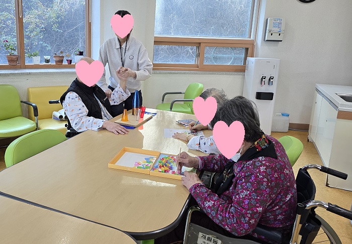 상지 관절가동범위 운동, 콘쌓기, 입체 초가집 만들기, 종이 입체 모자이크 꾸미기 활동을 해보았습니다.