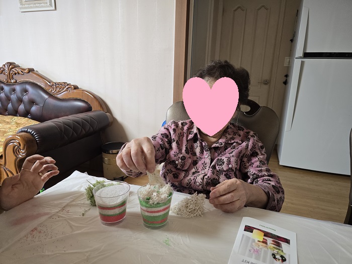 크리스마스 분위기의 색모래 오브제 만들기를 진행했으며