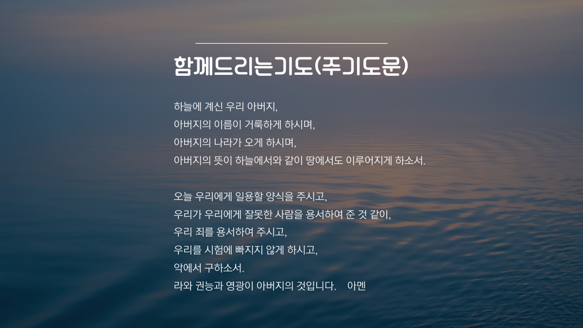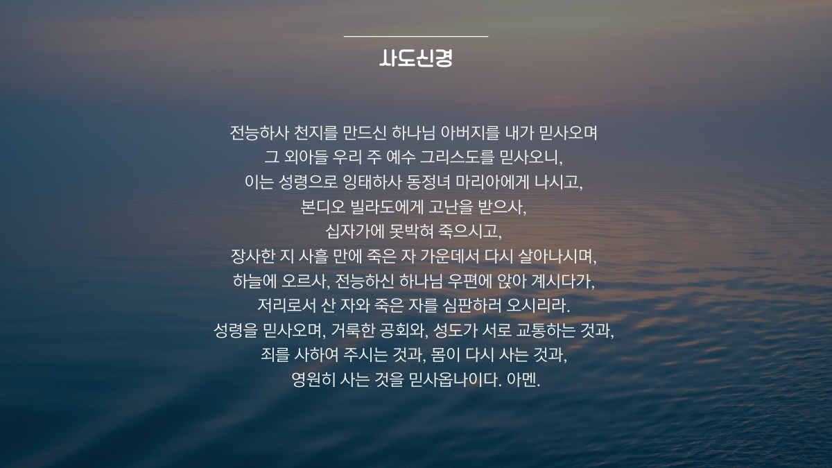 나는 전능하신 아버지 하나님, 천지의 창조주를 믿습니다. 나는 그의 유일하신 아들, 우리 주 예수 그리스도를 믿습니다.