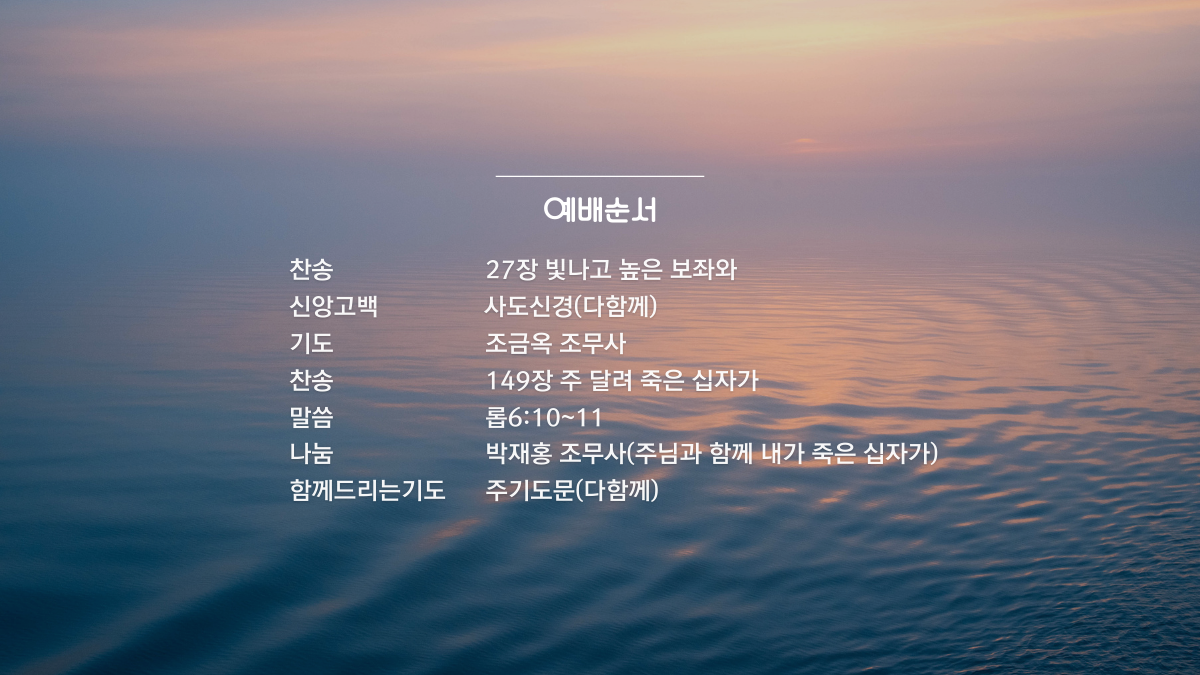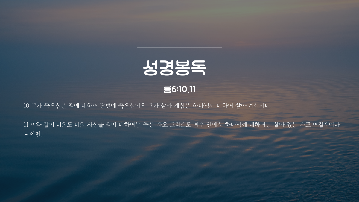 11 이와 같이 너희도 너희 자신을 죄에 대하여는 죽은 자요 그리스도 예수 안에서 하나님께 대하여는 살아 있는 자로 여길지어다 - 아멘.