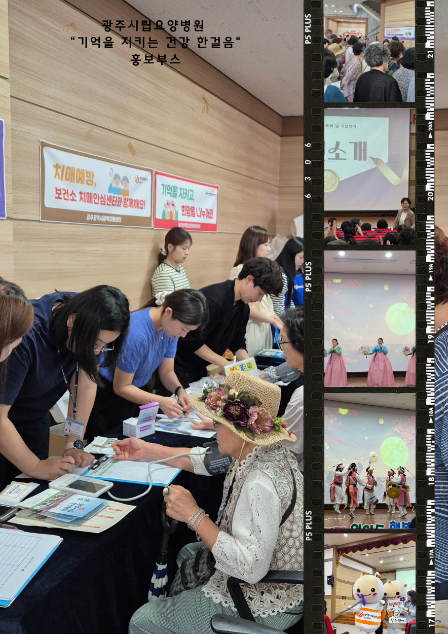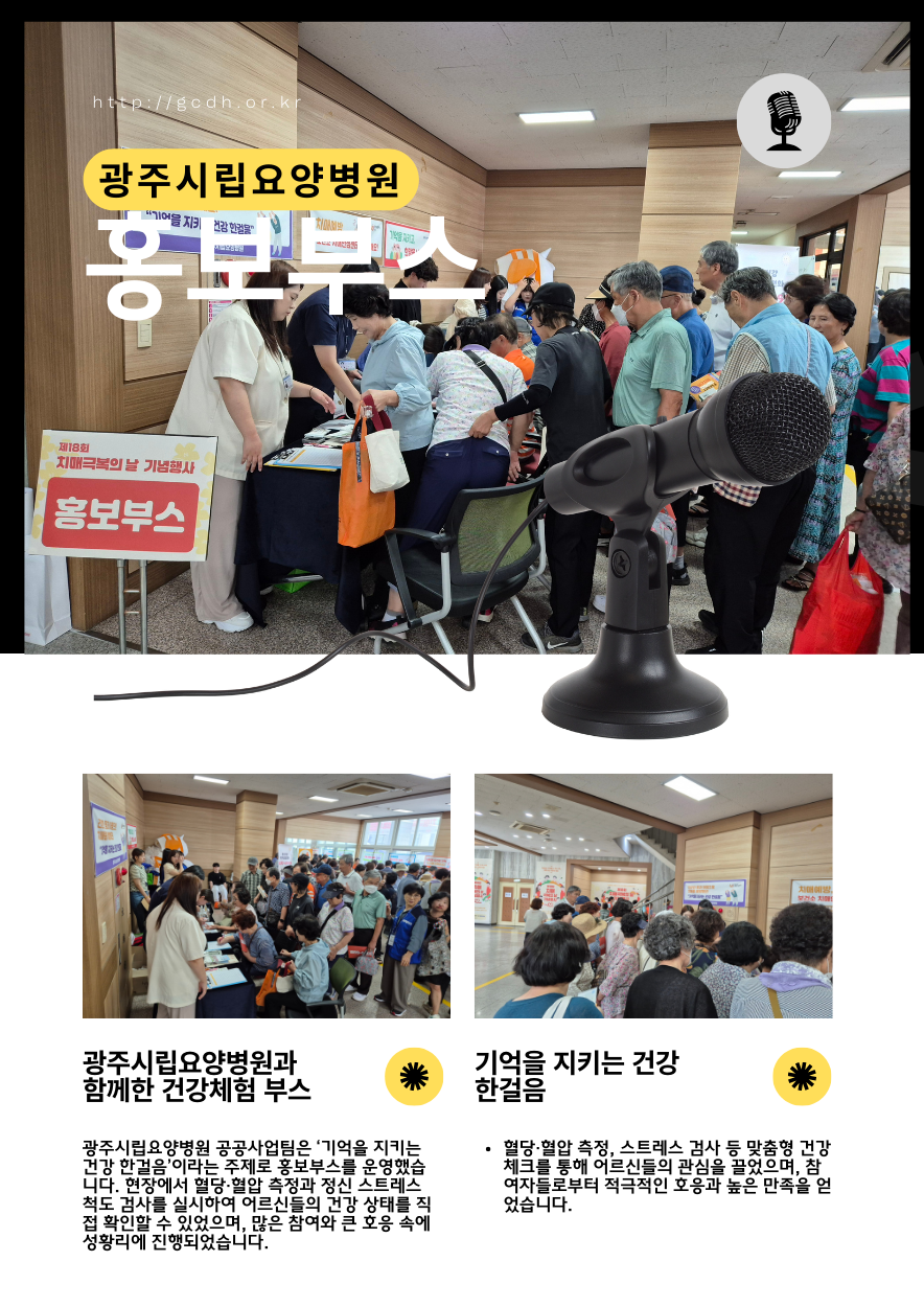 광주시립요양병원 공공사업팀은 ‘기억을 지키는 건강 한걸음’이라는 주제로 홍보부스를 운영했습니다. 현장에서 혈당·혈압 측정과 정신 스트레스 척도 검사를 실시하여 어르신들의 건강 상태를 직접 확인할 수 있었으며, 많은 참여와 큰 호응 속에 성황리에 진행되었습니다.