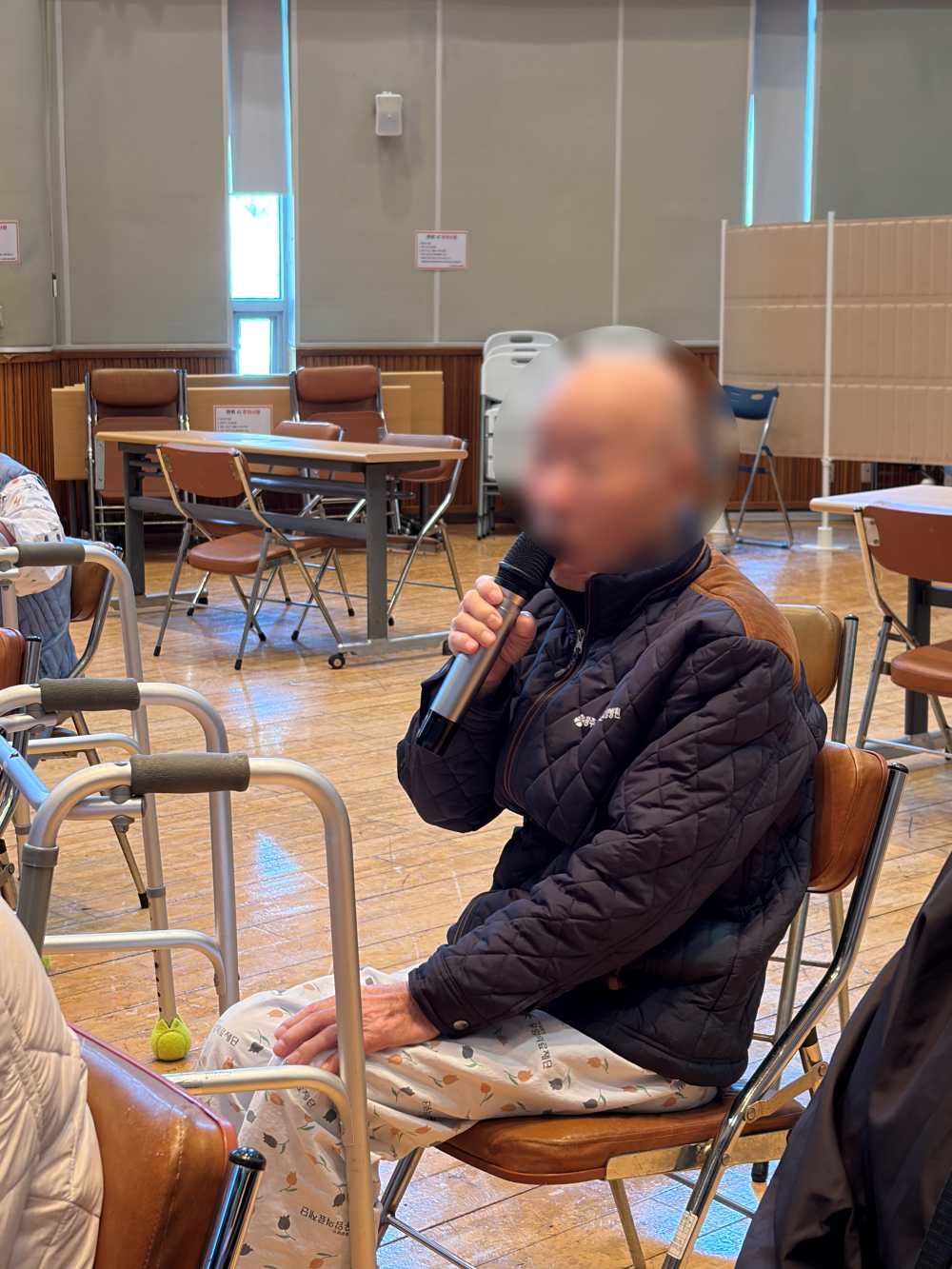 처음에는 참여 인원이 많아 다소 쑥스러워하시며 선뜻 노래를 부르지 못하셨지만, 시간이 지나면서 점차 분위기가 부드러워졌습니다. 이후에는 서로 노래를 신청하고 함께 따라 부르며 웃음이 넘치는 즐거운 시간을 보낼 수 있었습니다.
